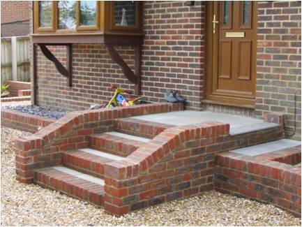 - to accommodate the drop in height, we removed the existing steps to the front door. These were replaced with significantly wider, character steps with inset sandstone paving. The steps were flanked with brick walls and finished with shaped, brick on edge capping