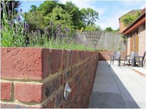 - Create an area outside the new extension to include a retaining wall containing integrated lighting, sandstone paving, feature steps to the lawn